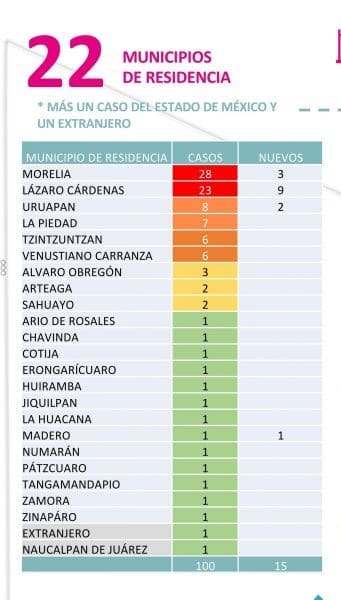 Los municipios más afectados hasta el momento son Moreliacon 25 casos, seguido de Lazaro Cárdenas con 18, La Piedad con 8, Tzintzuntzan 6, Uruapan 6 y Venustiano Carranza 6.