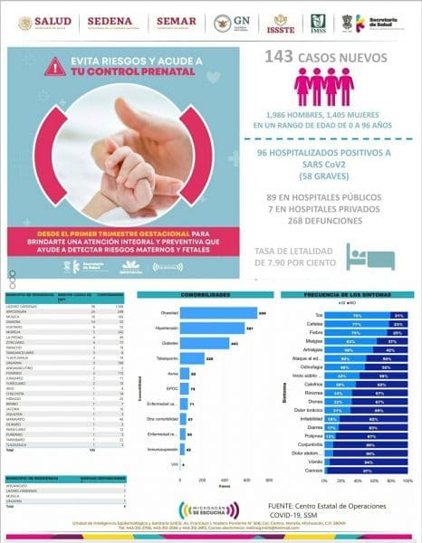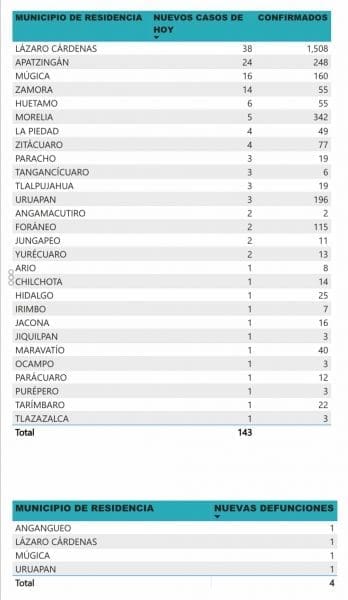 *- Michoacán reporto hoy 4 muertos por COVID-19 y 143 casos positivos en las últimas 24 horas.
