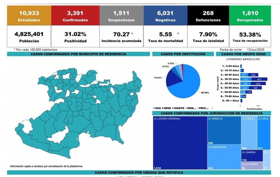 Michoacán suma 268 muertos y 3,391 casos acumulados por COVID-19
