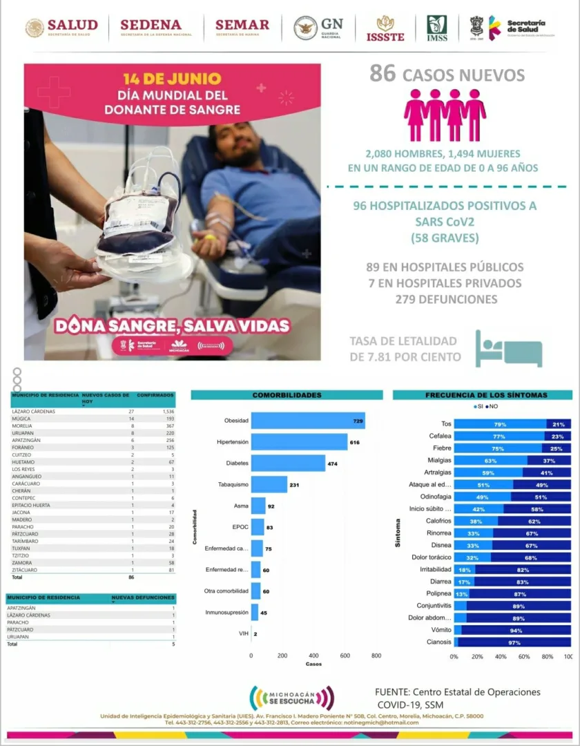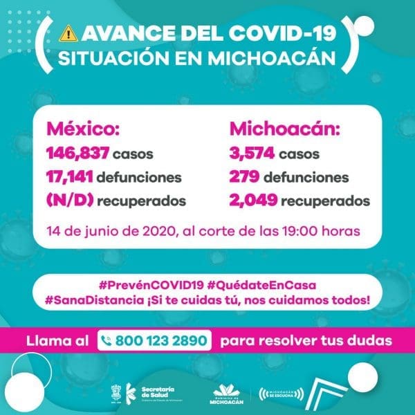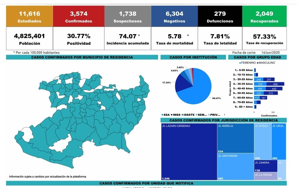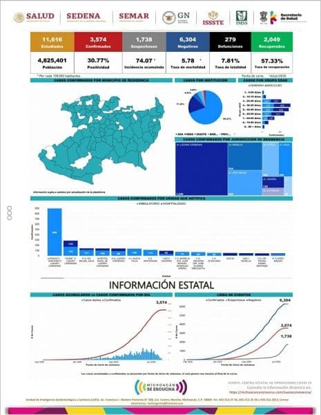 Zitácuaro Michoacán. El Comité Estatal de Seguridad en Salud reportó que al día de hoy 279 personas han muerto en Michoacán por COVID-19 y reporta 3,574 casos acumulados con reporte positivo de Coronavirus en diferentes municipios, esto es 86 casos nuevos en menos de 24 horas, entre los municipios más afectados se encuentran: LÁZARO CÁRDENAS, MORELIA, APATZINGÁN, URUAPAN, MÚGICA Y ZITÁCUARO.