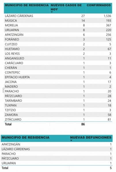 *- Michoacán reporto hoy 5 muertos por COVID-19 y 86 casos positivos en las últimas 24 horas.