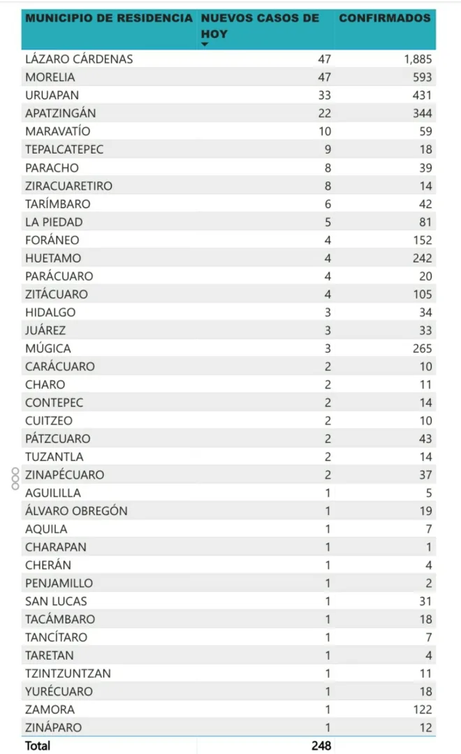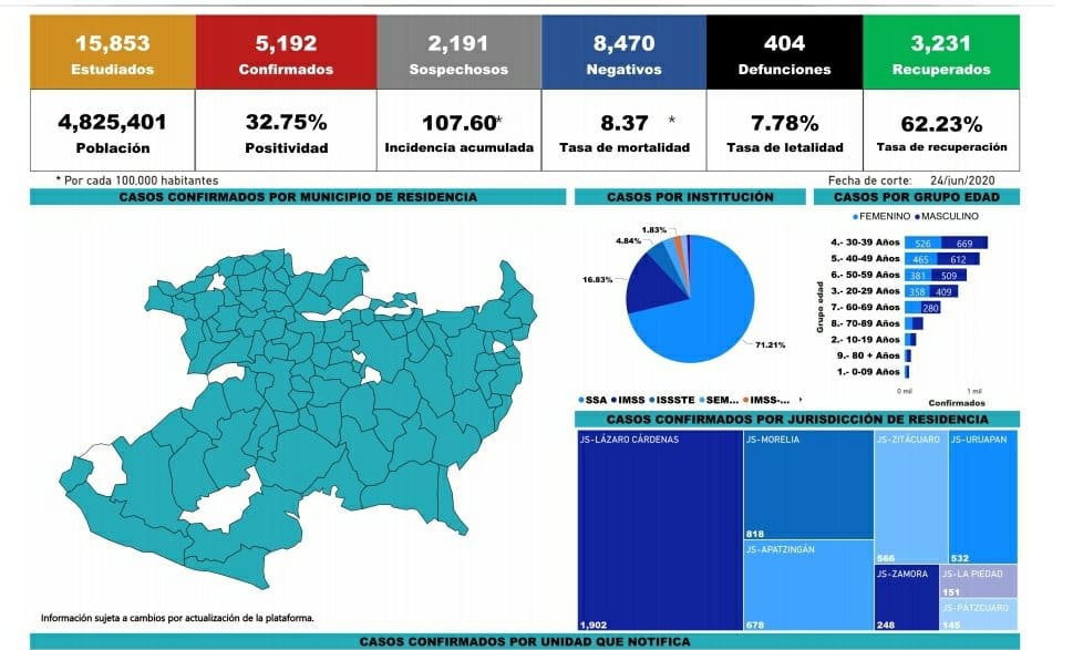 Zitácuaro Michoacán. El Comité Estatal de Seguridad en Salud reportó que al día de hoy 404 personas han muerto en Michoacán por COVID-19 y registra 5192 casos acumulados con reporte positivo de Coronavirus en diferentes municipios, esto es 248 casos nuevos en menos de 24 horas, entre los municipios más afectados se encuentran: LÁZARO CÁRDENAS, MORELIA, APATZINGÁN, URUAPAN, MÚGICA Y HUETAMO.