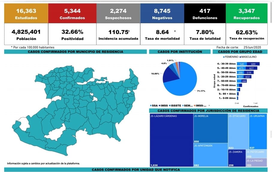 Zitácuaro Michoacán. El Comité Estatal de Seguridad en Salud reportó que al día de hoy 417 personas han muerto en Michoacán por COVID-19 y registra 5344 casos acumulados con reporte positivo de Coronavirus en diferentes municipios, esto es 152 casos nuevos en menos de 24 horas, entre los municipios más afectados se encuentran: LÁZARO CÁRDENAS, MORELIA, APATZINGÁN, URUAPAN, MÚGICA Y HUETAMO.