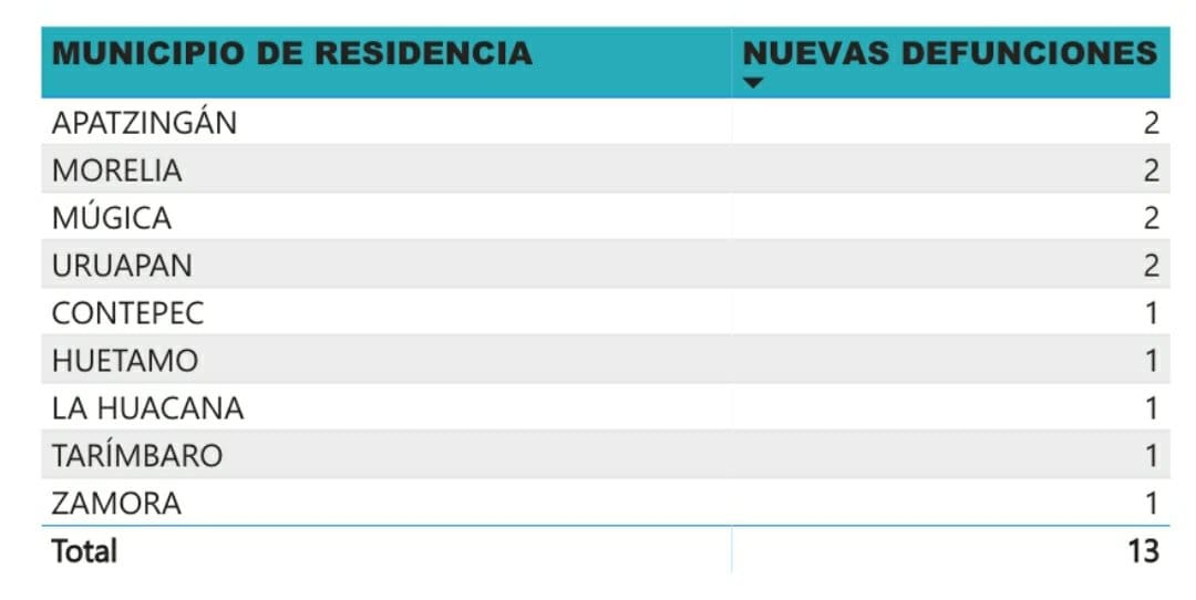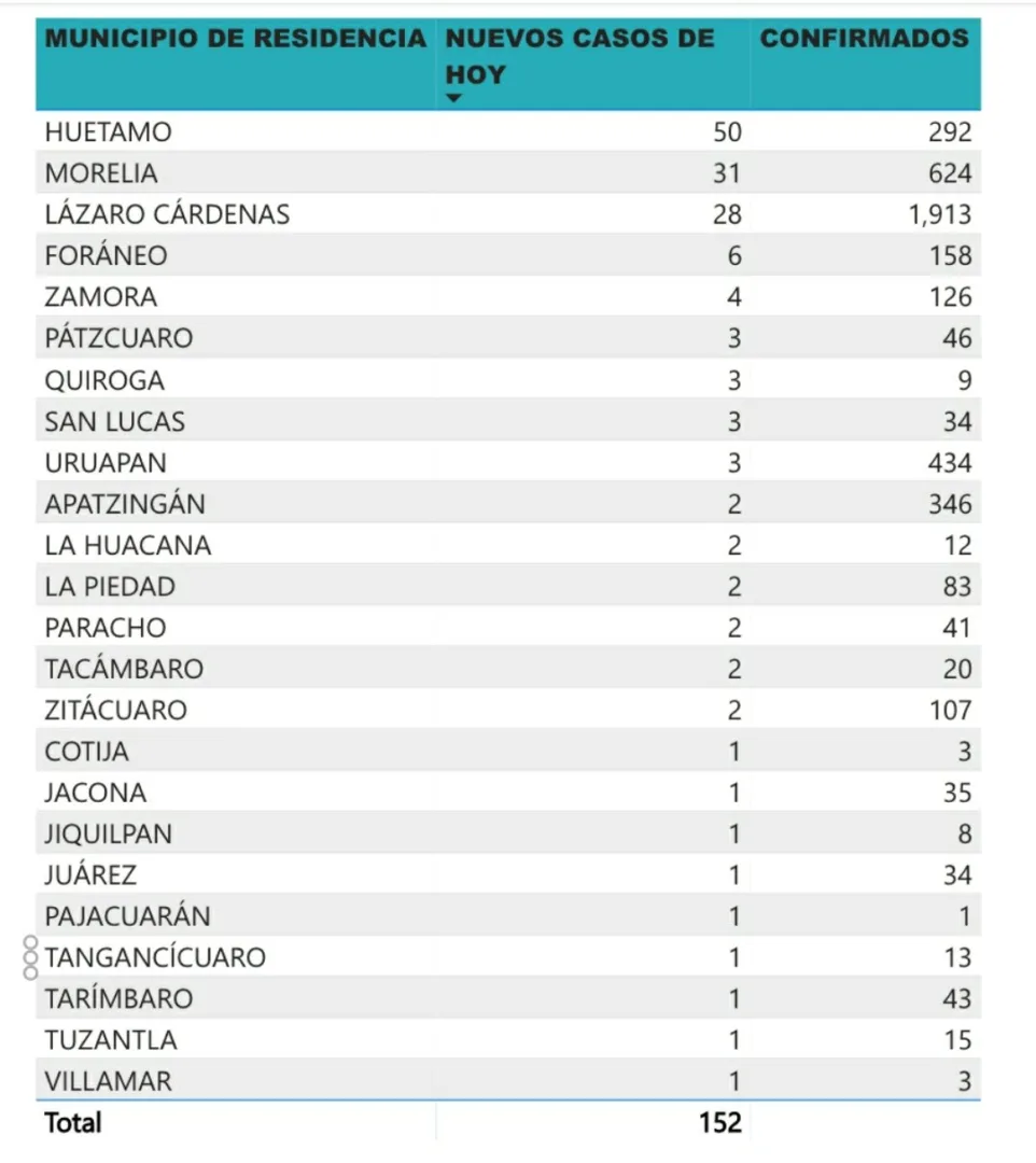 *- Michoacán registró en las últimas 24 horas 13 muertos y 152 casos nuevos por COVID-19.