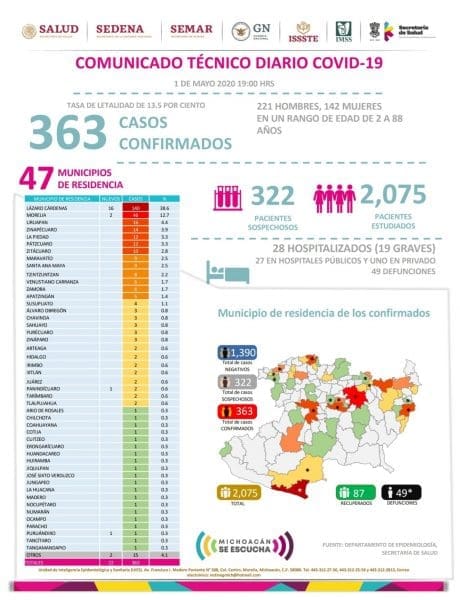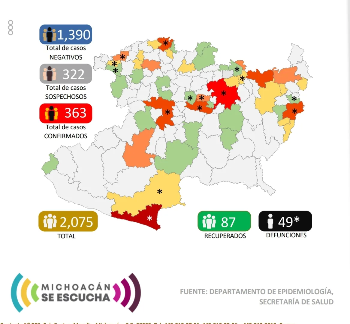 El Comité Estatal de Seguridad en Salud reportó que al día de hoy 49 personas han muerto en Michoacán por COVID-19 y reporta 363 casos confirmados en diferentes municipios, entre los municipios más afectados se encuentran: