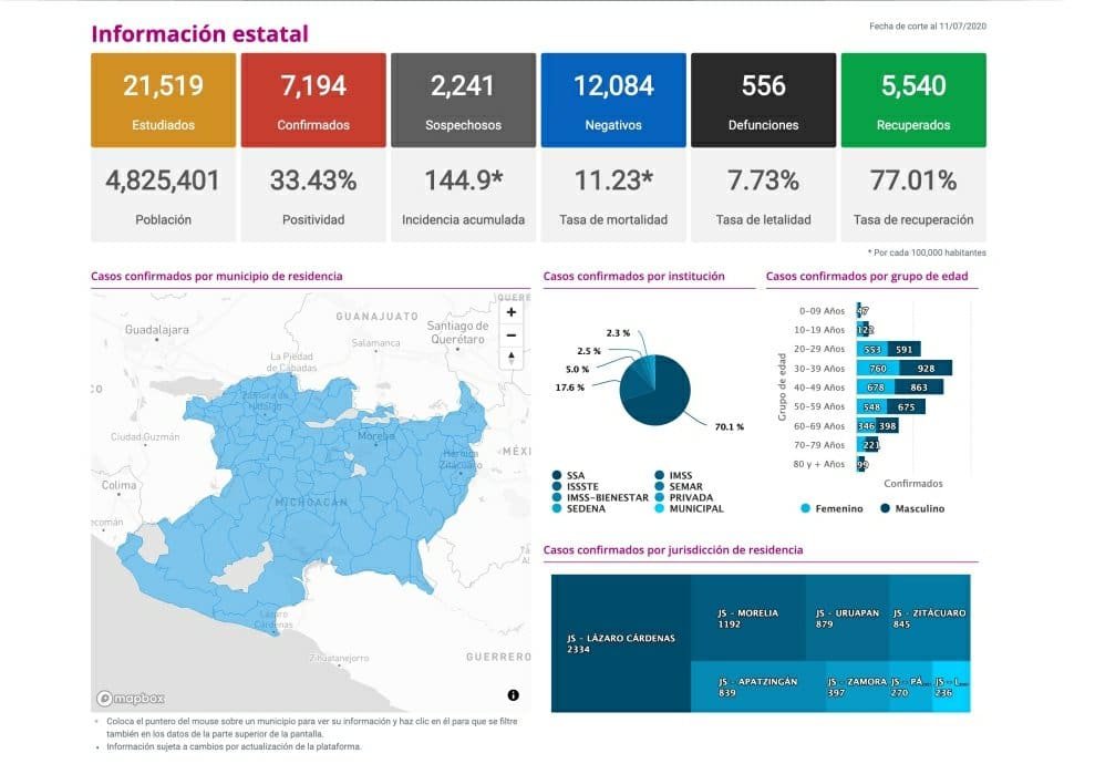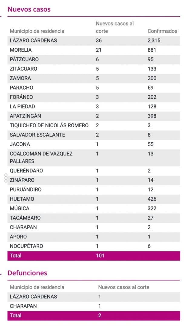 *- Michoacán registró en las últimas 24 horas 2 muertos y 101 casos nuevos por COVID-19, suman 556 defunciones y 7194 casos acumulados.