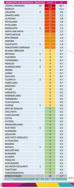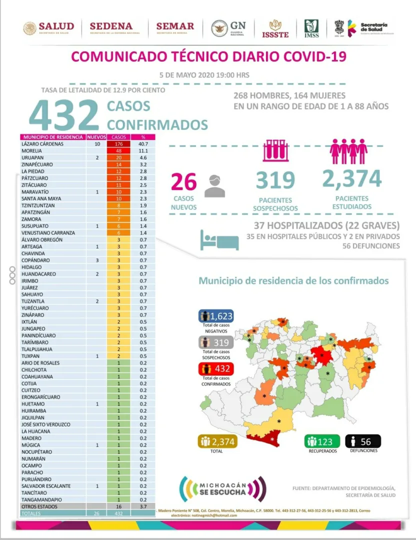 Michoacán suma 56 muertos y 432 casos confirmados de COVID-19, Zitácuaro suma 11, Susupuato 6. Tuzantla 3, Benito Juárez 3, Jungapeo 2. Hidalgo 3.