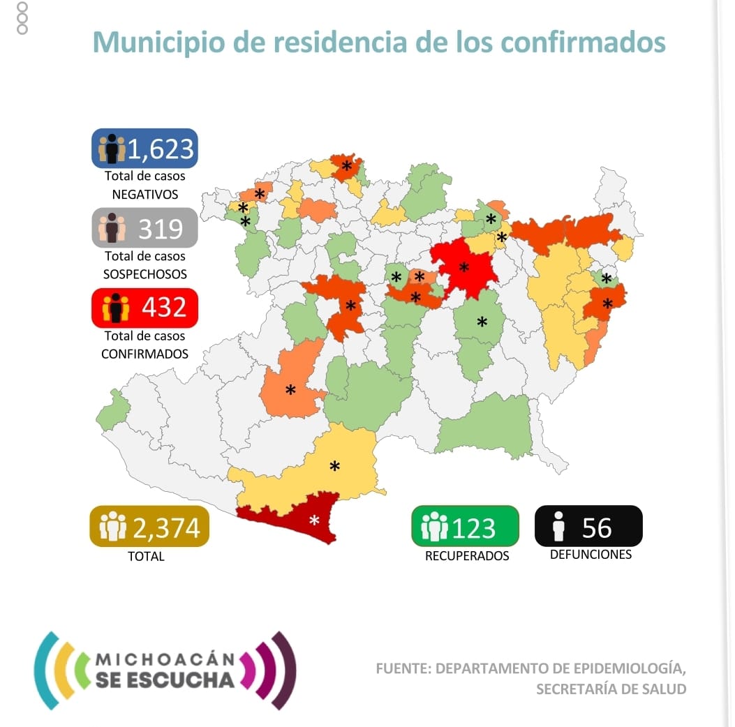 Michoacán suma 56 muertos y 432 casos confirmados de COVID-19, Zitácuaro suma 11, Susupuato 6. Tuzantla 3, Benito Juárez 3, Jungapeo 2. Hidalgo 3.