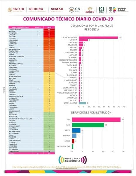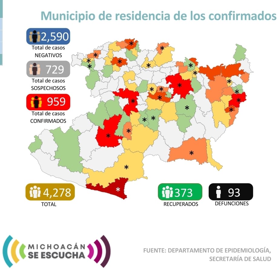 Zitácuaro Michoacán. El Comité Estatal de Seguridad en Salud reportó que al día de hoy 93 personas han muerto en Michoacán por COVID-19 y reporta 959 casos acumulados con reporte positivo de Coronavirus en diferentes municipios, esto es 14 casos nuevos en las últimas 24 horas, entre los municipios más afectados se encuentran:
