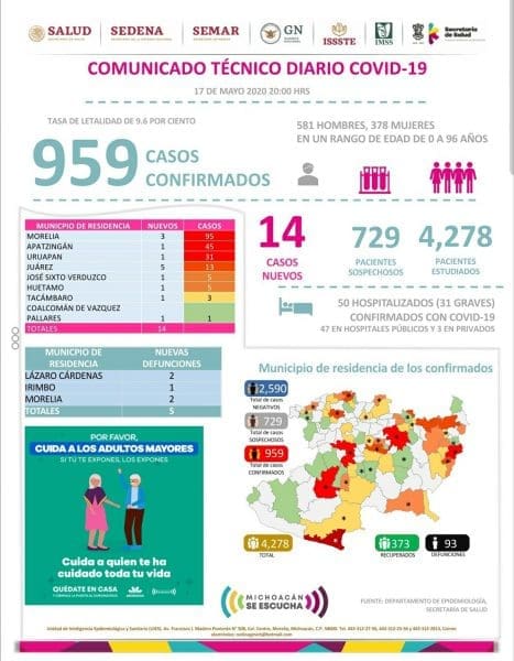 ¤ Michoacán reportó este día 93 muertes por COVID-19 y 959 casos positivos acumulados, esto es 14 casos nuevos en las últimas 24 horas.