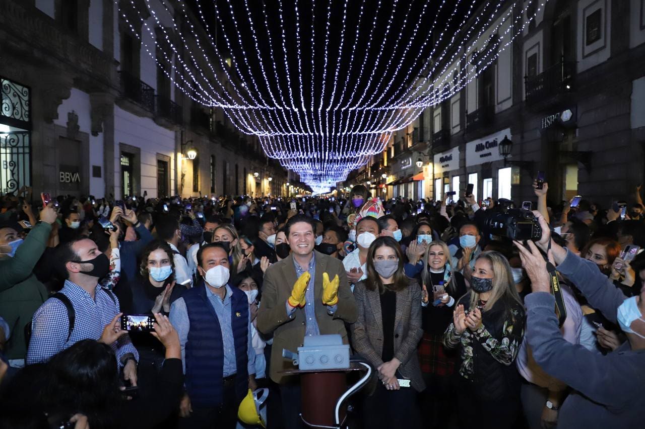 El presidente municipal, Alfonso Martínez Alcázar, acompañado de su esposa y presidenta honoraria del DIF Morelia, Paola Delgadillo, encendió la iluminación sobre la avenida Madero, ante cientos de morelianas y morelianos que se dieron cita en el corazón de la ciudad, para disfrutar de este evento.