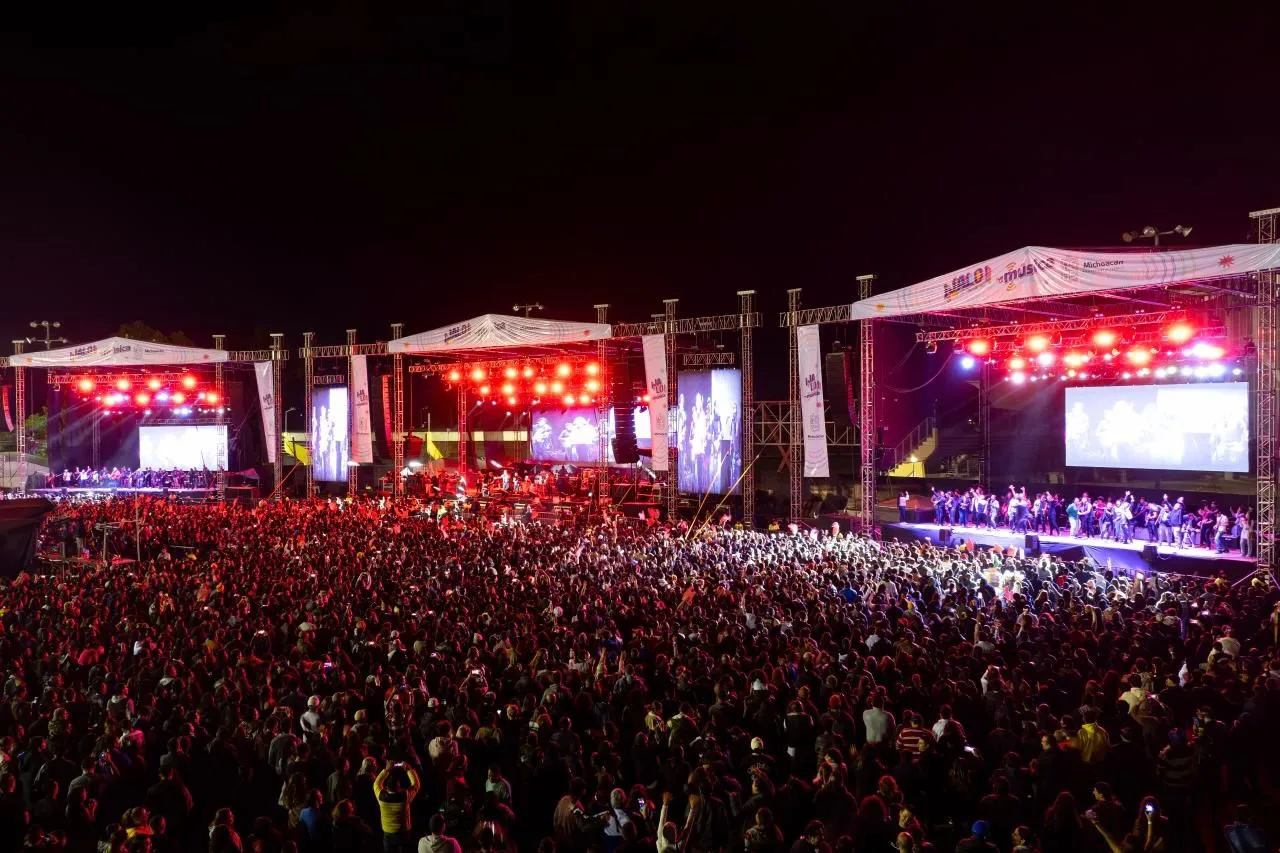 Morelia, Michoacán, 9 de diciembre de 2023.- La música unió esta noche a más de 100 artistas michoacanos en el Estadio Francisco Villa de Morelia, como parte del Festival Jalo que organiza el Gobierno del Estado, con un emotivo flashmob que cautivó a miles de asistentes.