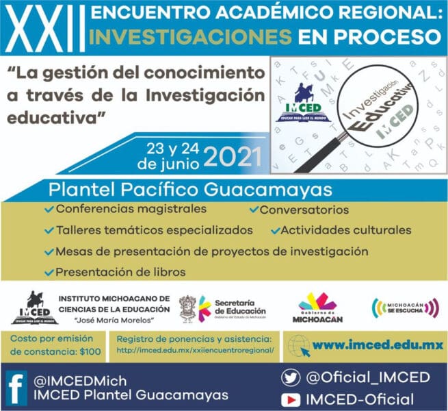 Lázaro Cárdenas, Michoacán, a 22 de junio de 2021.- Mañana dará inicio de manera virtual en el plantel Pacífico Guacamayas del Instituto Michoacano de Ciencias de la Educación la última fase del XXII Encuentro Académico Regional de Investigaciones en Proceso, con la presentación de conferencias magistrales, talleres, exposición de proyectos de investigación y actividad cultural.