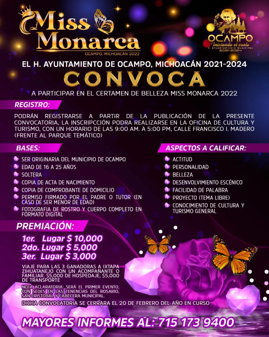 Ocampo, Mich.- El H. Ayuntamiento de Ocampo invita a las señoritas del municipio a participar en el Certamen de Belleza “Miss Monarca 2022”.