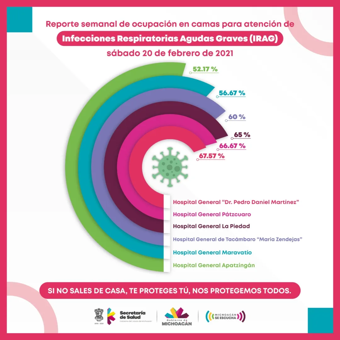 Morelia, Michoacán, a 20 de febrero de 2021.- Derivado del comportamiento epidemiológico por COVID-19, siete hospitales de la Secretaría de Salud de Michoacán (SSM), registran una ocupación arriba del 50 por ciento en camas reconvertidas para la atención de Infecciones Respiratorias Agudas Graves (IRAG).