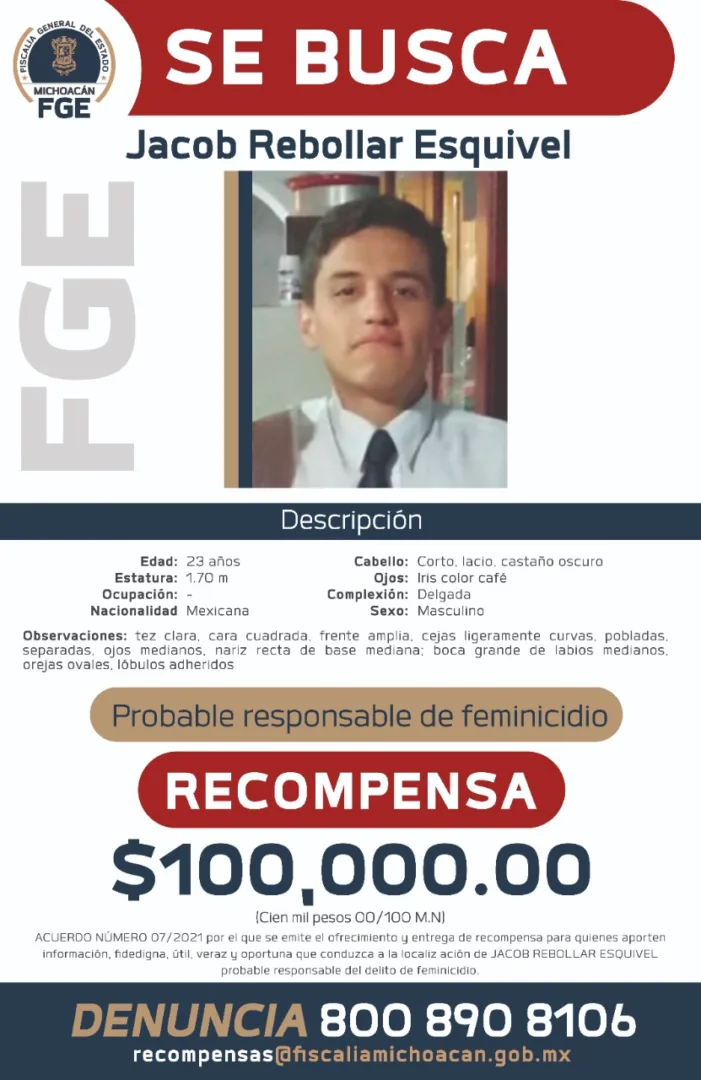 Por lo anterior y de conformidad con las atribuciones que le confiere la Ley Orgánica de la Fiscalía General del Estado de Michoacán, para el ofrecimiento y entrega de recompensas, el Maestro Adrián López Solís, Fiscal General, firmó el Acuerdo Específico Número 7/2021, “Ofrecimiento y entrega de recompensa para la localización y detención de JACOB REBOLLAR ESQUIVEL”, publicado con fecha 6 de julio del año en curso en el Periódico Oficial del Estado.
