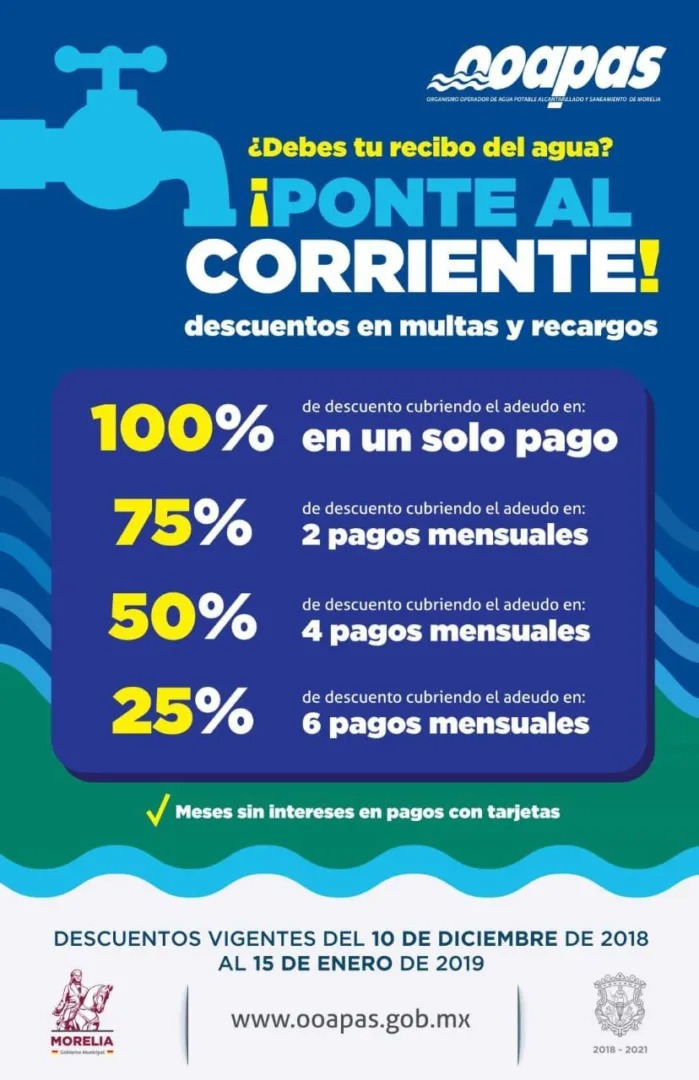 El Organismo Operador de Agua Potable, Alcantarillado y Saneamiento de Morelia (OOAPAS) informa que a partir del lunes 10 de diciembre iniciarán dos campañas para promover el pago del agua: una dirigida a los usuarios cumplidos a través del Programa de Pago Anticipado, donde los usuarios recibirán un descuento del cinco por ciento al pagar su consumo promediado del 2019; y otra para los usuarios con promoción de descuentos en multas y recargos para los usuarios que presenten adeudo en su recibo.
