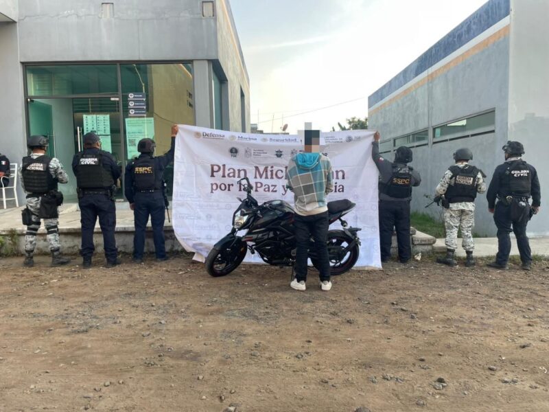 En el municipio de Zamora, elementos de la Guardia Civil y la Guardia Nacional detuvieron a un hombre y una mujer que portaban 21 envoltorios de una sustancia con características de metanfetamina. En una acción distinta dentro de la misma cabecera municipal, las autoridades recuperaron una motocicleta de la marca Italika que contaba con reporte de robo vigente.
