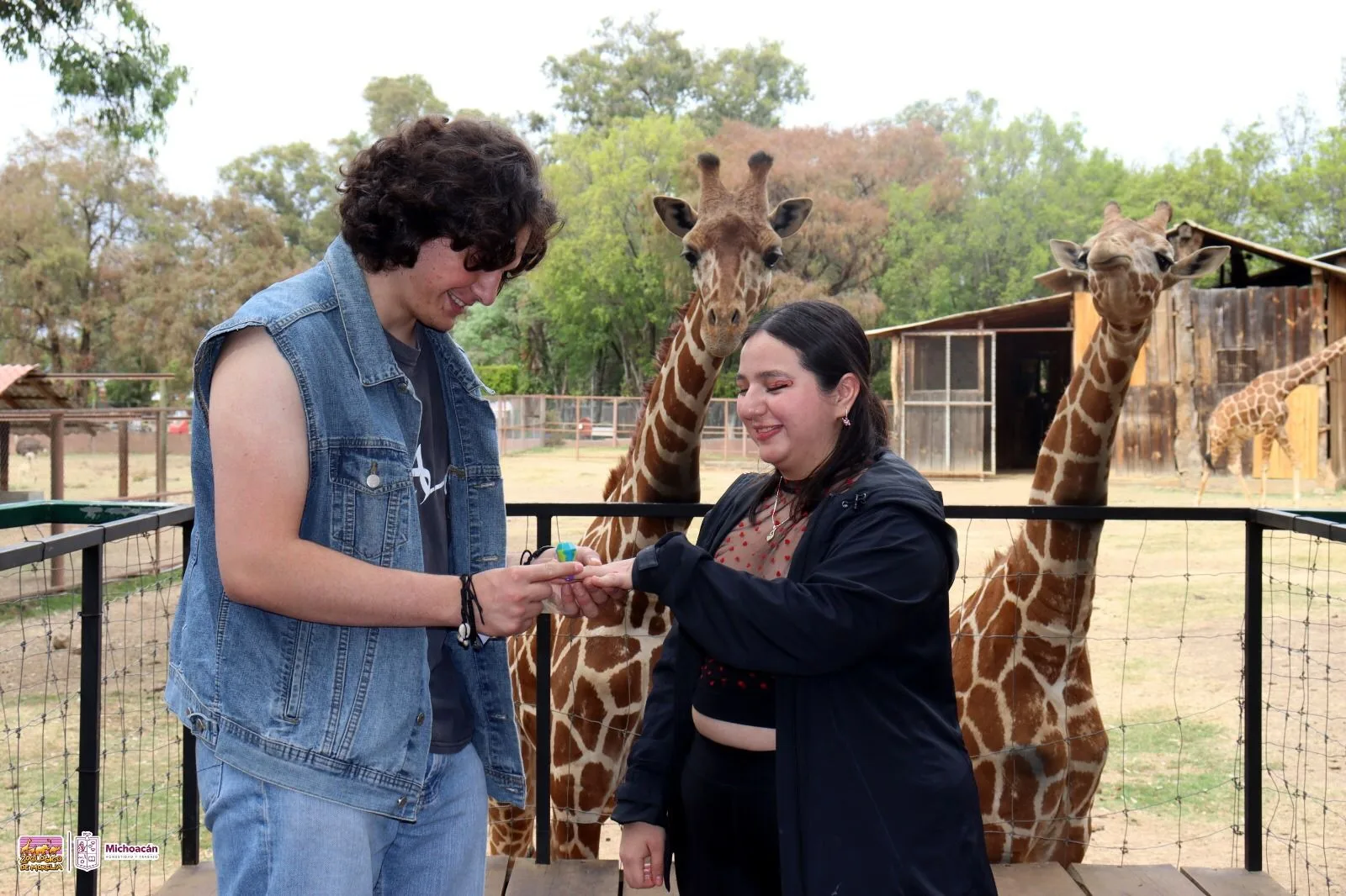 La actividad que se realizó con motivo del 14 de febrero, forma parte de la experiencia educativa Contando Manchas que ofrece el recinto faunístico, una interacción con las jirafas en la que puedes darles de comer, acariciarlas y tomarte fotografías con ellas.