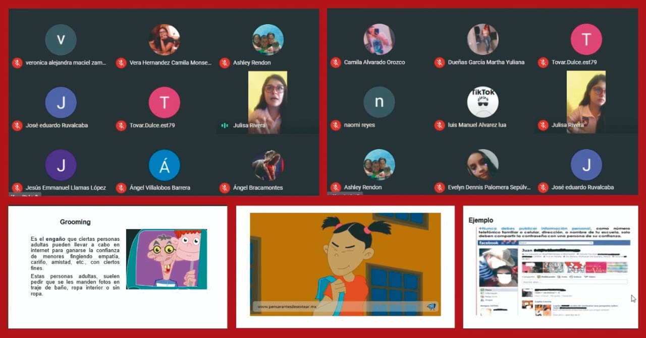 Asimismo, el alumnado que interactuó de forma virtual exploró lo qué es un delito cibernético, como el ciberbullyng, sexting, sextorsión, grooming, pornografía infantil, suplantación de identidad, extorsión telefónica y sus modalidades.