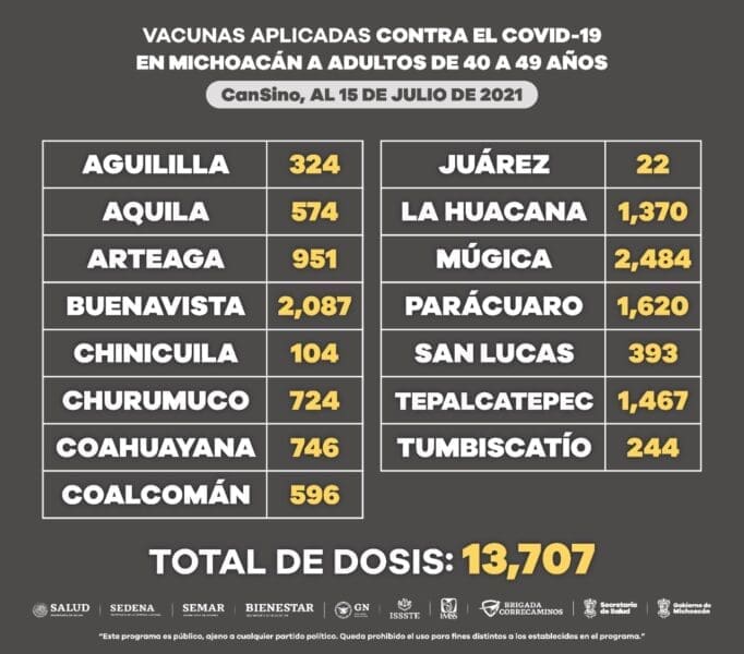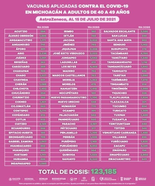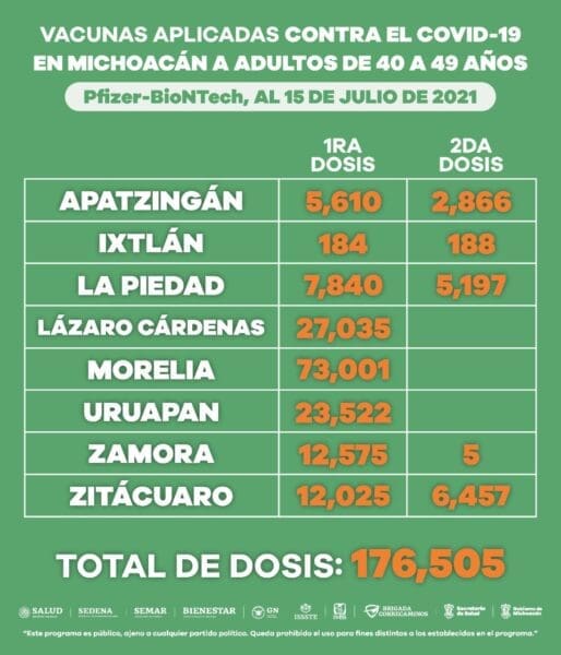 Morelia, Michoacán, a 15 de julio de 2021.- En la entidad se han aplicado 348 mil 396 dosis de la vacuna anti-COVID-19 a personas de entre 40 y 49 años de edad, informó la Secretaría de Salud de Michoacán (SSM).