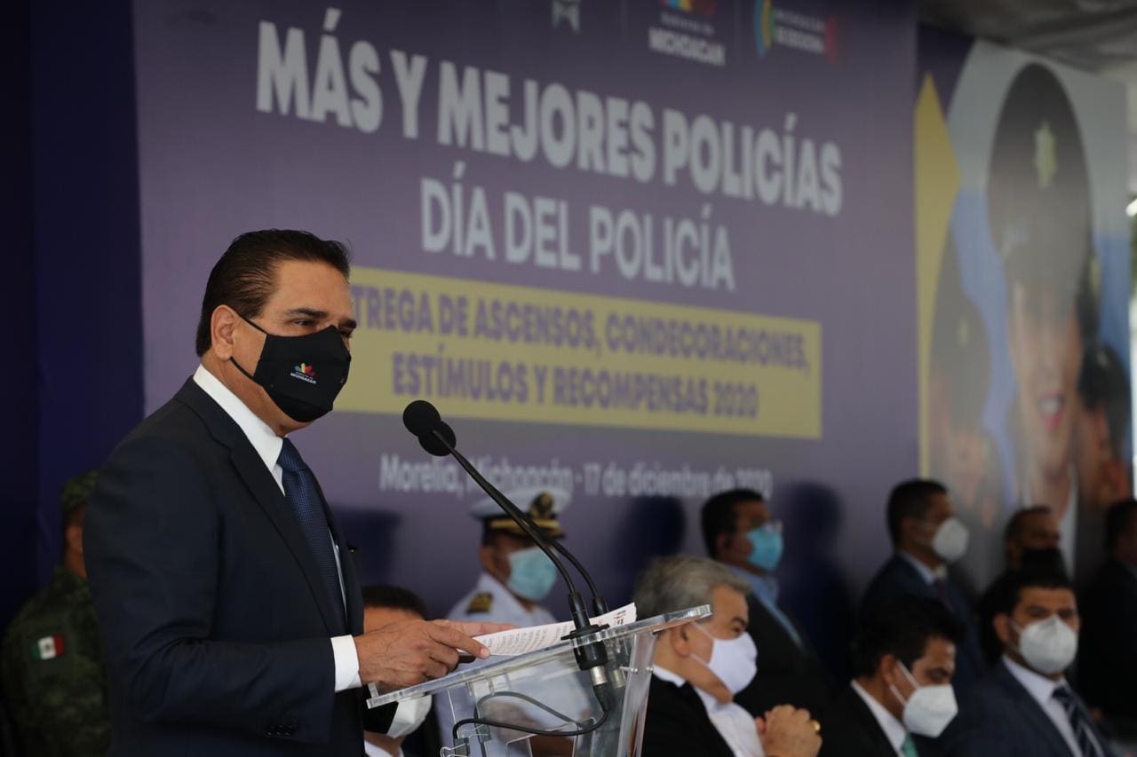 “La responsabilidad de la Policía se ha visto reflejada en mantener acciones firmes para brindar la seguridad en los 113 municipios. En este año se han enfrentado otros retos donde la vocación de servir ha quedado clara al llevar a cabo la entrega de más de 258 mil despensas, como parte del programa Michoacán Alimenta y las labores de proximidad social para evitar mayores contagios de la pandemia que hoy vivimos”, recordó.