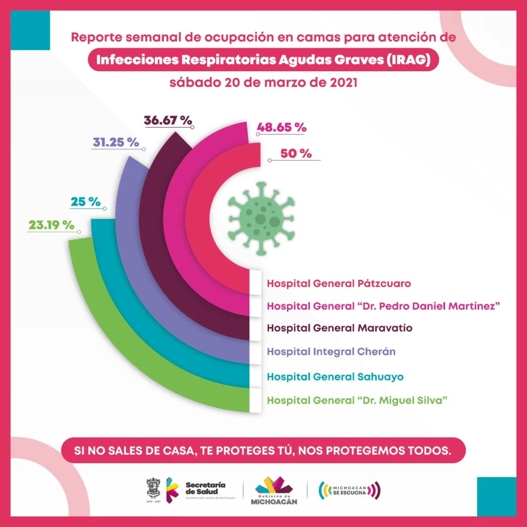 Morelia, Michoacán, a 20 de marzo de 2021.- Gracias a las acciones implementadas por las instituciones del sector salud y al trabajo coordinado entre el gobierno estatal y de los municipios, los hospitales con camas reconvertidas para la atención de Infecciones Respiratorias Agudas Graves (IRAG), de la Secretaría de Salud de Michoacán (SSM), se encuentran por debajo del 50 por ciento de su capacidad.