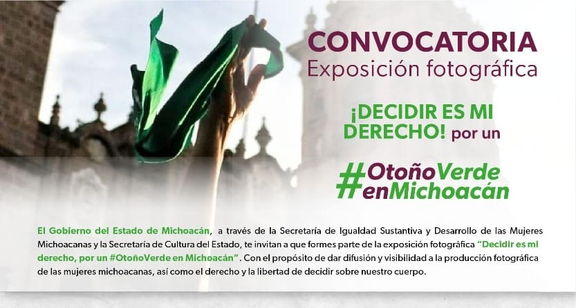 Morelia, Michoacán, 17 de agosto del 2022.- El Gobierno de Michoacán, a través de la Secretaría de Igualdad Sustantiva y Desarrollo de las Mujeres Michoacanas (Seimujer), convoca a fotógrafas aficionadas o profesionales a postular sus obras para la exposición “¡Decidir es mi derecho! Por un #OtoñoVerdeenMichoacán”, del 17 al 29 de agosto.
