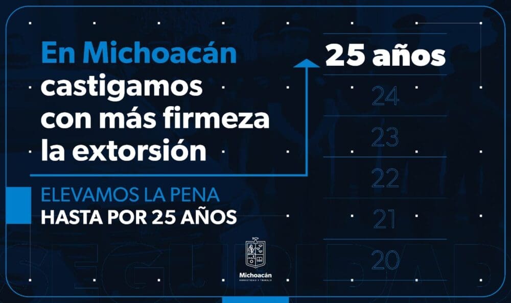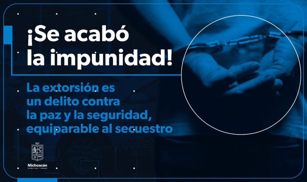 Morelia, Michoacán, a 31 de julio de 2023.- En Michoacán el delito de extorsión se castiga con penas más severas, luego de la entrada en vigor el pasado 2 de marzo de la reforma al Código Penal para el Estado de Michoacán, que establece hasta 25 años de prisión y multas equivalentes a 500 días.