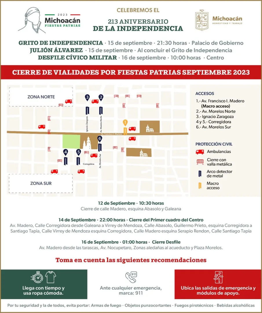 A partir del 14 de septiembre a las 22:00 horas y hasta el día del “Grito de la Independencia”, el 15 del mismo mes, se cerrará el primer cuadro de la ciudad que contempla: la Av. Madero, calle Corregidora desde Galeana a Virrey de Mendoza; las calles Abasolo, Guillermo Prieto, esquina con Corregidora a Santiago Tapia; Virrey de Mendoza esquina con Corregidora; Av. Madero esquina con Serapio Rendón y Santiago Tapia.