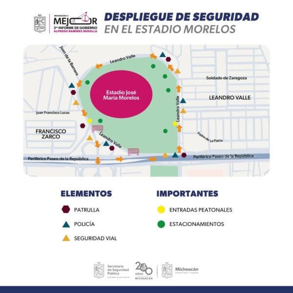 Morelia, Michoacán, 20 de septiembre de 2024 – La Secretaría de Seguridad Pública (SSP) ha organizado un operativo vial para asegurar el flujo de tráfico en los alrededores del Estadio Morelos con motivo del Tercer Informe de Gobierno de Alfredo Ramírez Bedolla. Desde las 7:00 de la mañana, 150 agentes de seguridad estarán desplegados en la zona.