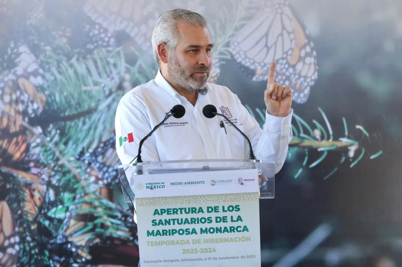 Morelia, Michoacán, 10 de diciembre de 2023.- El gobernador Alfredo Ramírez Bedolla, afirmó que con el presupuesto 2024 aumentará el pago por hectárea conservada en la zona núcleo de la Reserva de la Biósfera de la Mariposa Monarca.