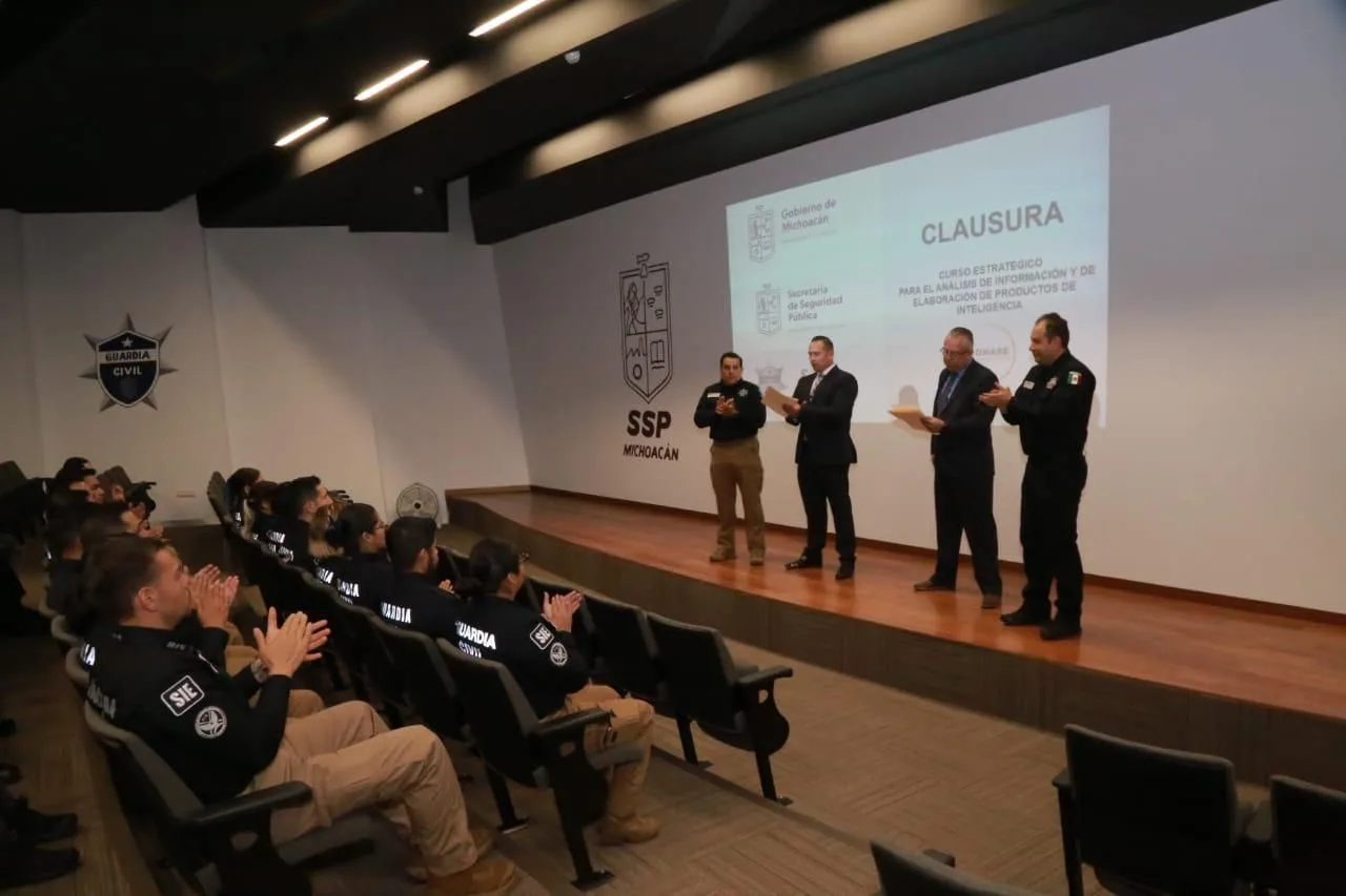 Morelia, Michoacán, 9 de febrero de 2024.- Para la Secretaría de Seguridad Pública (SSP) es prioridad dotar a su personal de herramientas y conocimientos vanguardistas, a fin de brindar un servicio público profesional, por ello, los elementos de la Subsecretaría de Investigación Especializada (SIE) recibieron el Curso Estratégico para el Análisis de Información y de Elaboración de Productos de Inteligencia.