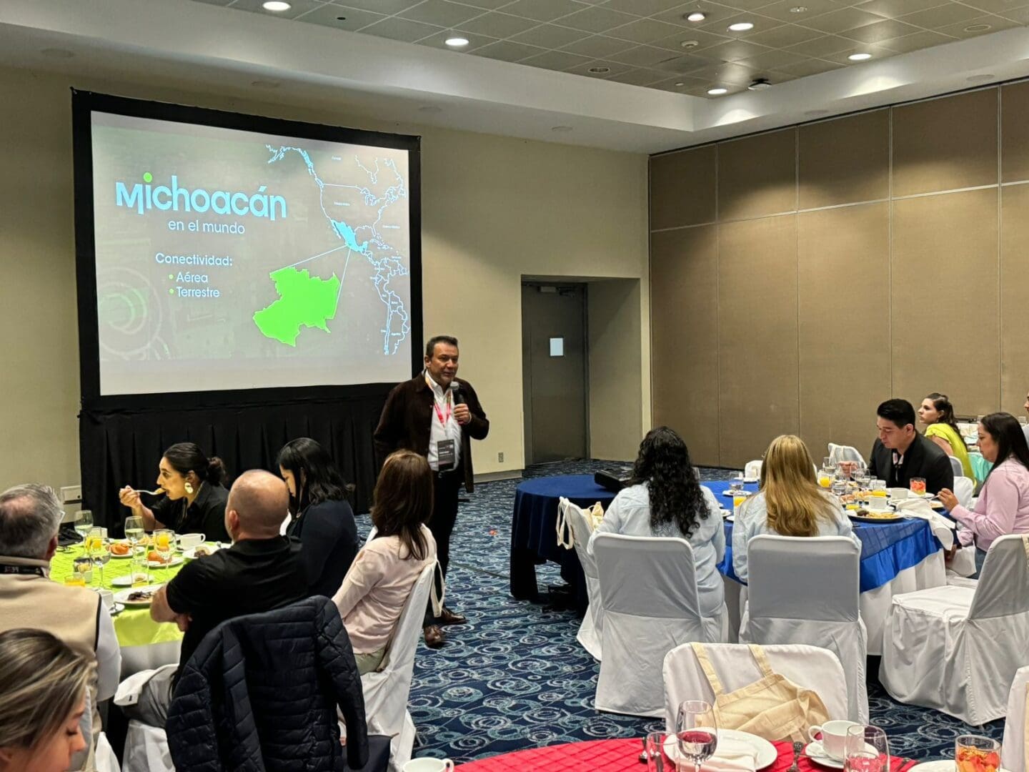 Ante un aproximado de 100 profesionales del sector, el encargado de la política turística en el estado mostró la conectividad, Pueblos Mágicos, las siete regiones, la gastronomía y todos los beneficios que hay en Michoacán para realizar sus eventos.
