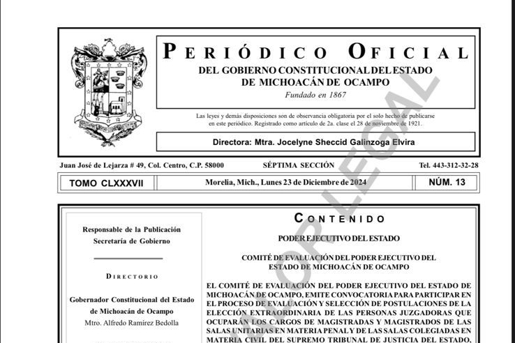 Morelia, Michoacán, 24 de diciembre de 2024.- El Comité de Evaluación publica la convocatoria para que las y los profesionales del derecho participen en el proceso de selección de magistradas, magistrados, juezas y jueces del Poder Judicial de Michoacán.