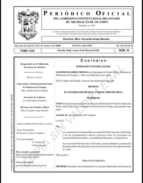 Publica la Secretaría de Gobierno decreto constitucional contra el endeudamiento estatal