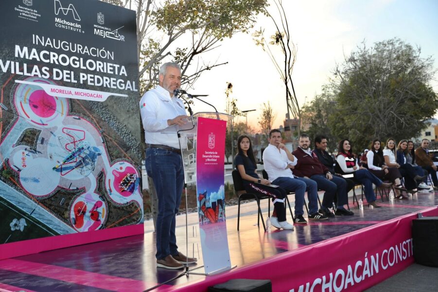 Morelia, Michoacán, 21 de noviembre de 2025. El gobernador Alfredo Ramírez Bedolla inauguró la macroglorieta de Villas del Pedregal, un proyecto que, según el Gobierno del Estado, representa una inversión 100 por ciento estatal de 20 millones de pesos destinada al rescate de este espacio público al poniente de Morelia.