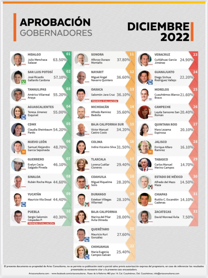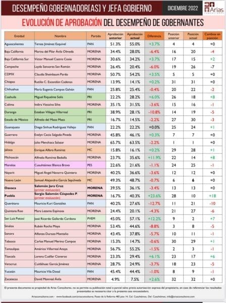 La consultora Arias ubicó un crecimiento de casi 12 por ciento de una medición a otra del Ejecutivo estatal. Tiene mejor aprobación que otros gobernadores como: Cuauhtémoc Blanco (Morelos); Samuel García (Nuevo León), Mauricio Kuri (Querétaro) y Mara Lezama Espinosa (Quintana Roo), por citar algunos.