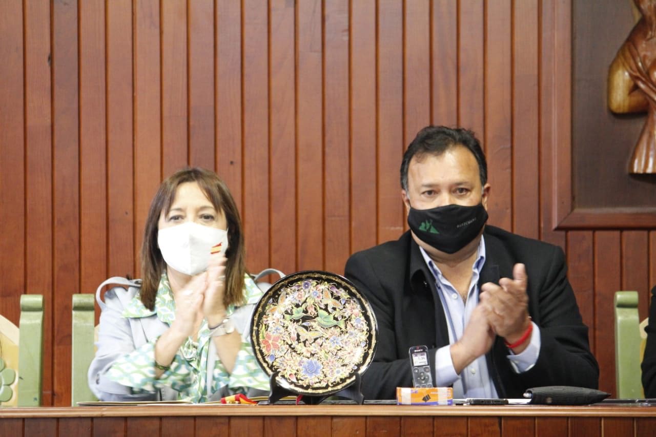 Desde el recinto del Antiguo Palacio Municipal, el Edil Julio Arreola Vázquez dio la bienvenida y agradecimiento a su homóloga española, por confirmar esta alianza, a quien además, entregó un presente como gesto de gratitud.