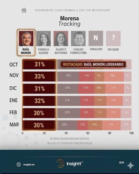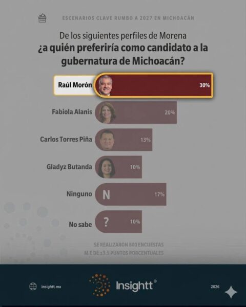El senador Raúl Morón Orozco se posicionó como el perfil con mayor respaldo ciudadano para encabezar la candidatura de Morena al Gobierno de Michoacán en el proceso electoral de 2027. De acuerdo con el más reciente estudio de la casa encuestadora Insightt, el legislador registra el 30 por ciento de las preferencias, consolidando una tendencia ascendente conforme se aproximan los periodos de definición política al interior del partido guinda.