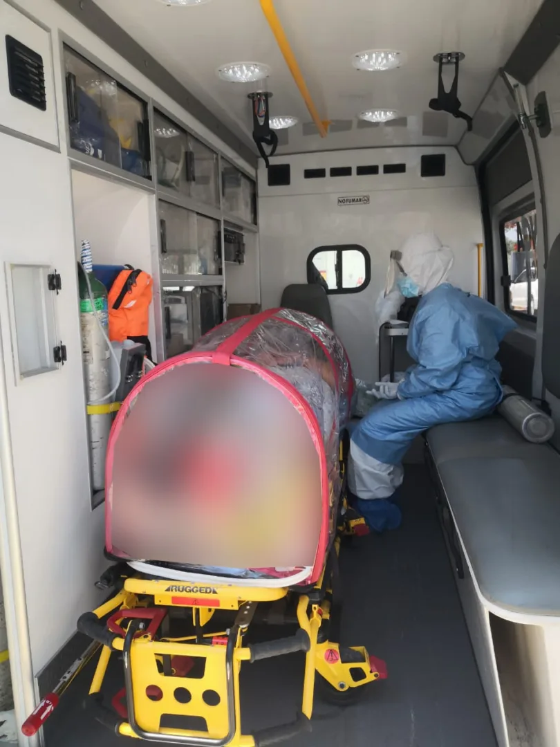 En cada traslado, personal del CRUM cuenta con una cápsula limpia y desinfectada donde lleva al enfermo al hospital que va ser atendido y al bajarlo se queda con el material usado para su limpieza y sanitización para otro servicio.