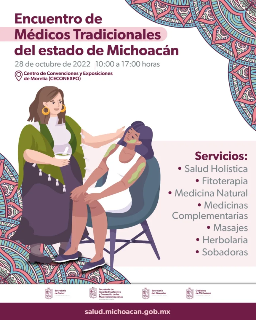 Morelia, Michoacán, 25 de octubre del 2022.- La Secretaría de Salud de Michoacán (SSM) realizará, el próximo 28 de octubre, el Encuentro de Médicos Tradicionales del Estado de Michoacán, que contará con la participación de 40 expertos en salud holística, fitoterapia, medicina natural, masajes, herbolaria y medicinas complementarias.