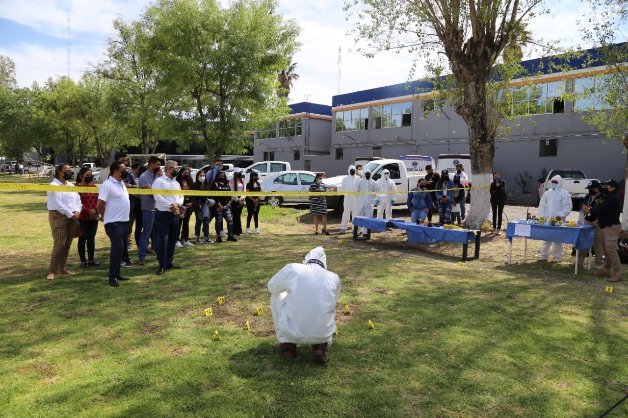 En el marco de esta actividad, dirigida a alumnas y alumnos de la Licenciatura en Derecho y Ciencias Sociales, un equipo multidisciplinario encabezado por el coordinador general de Servicios Periciales, Pedro Gutiérrez Gutiérrez, explicó en qué consisten las actuaciones que se realizan durante la escena de un crimen y las correspondientes al levantamiento de un cadáver.