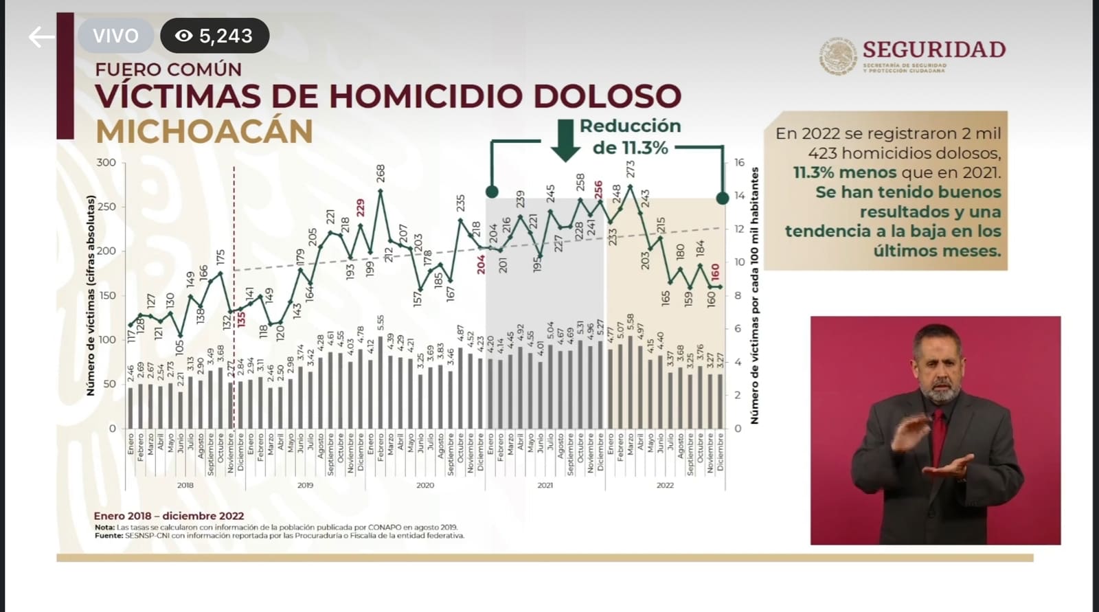 Morelia, Michoacán.- Durante 2022 en Michoacán se registraron dos mil 423 homicidios dolosos, lo que representa una disminución del 11.3 por ciento en comparación con el 2021, en el que se registraron dos mil 734 homicidios dolosos, reconoció este martes en rueda de prensa matutina el Gobierno de México que encabeza Andrés Manuel López Obrador.