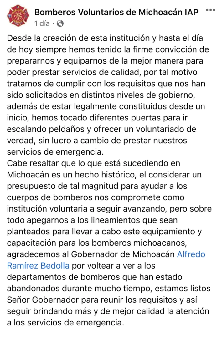 Dejaron en claro “agradecemos al gobernador de Michoacán, Alfredo Ramírez Bedolla por voltear a ver a los departamentos de bomberos que han estado abandonados durante mucho tiempo, estamos listos para seguir brindando más y mejor calidad la atención a los servicios de emergencia”.