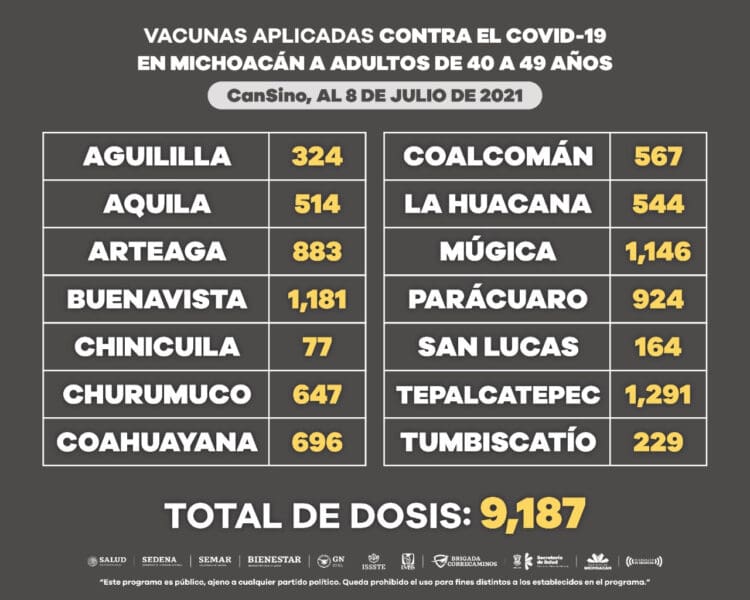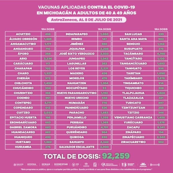 A este sector de la población se le han aplicado 271 mil 405 dosis de vacuna anti COVI-19, de las cuales 92 mil 259 corresponden a AstraZeneca, 9 mil 187 a CanSino, 149 mil 357 a Pfizer y 20 mil 602 a Sinovac.