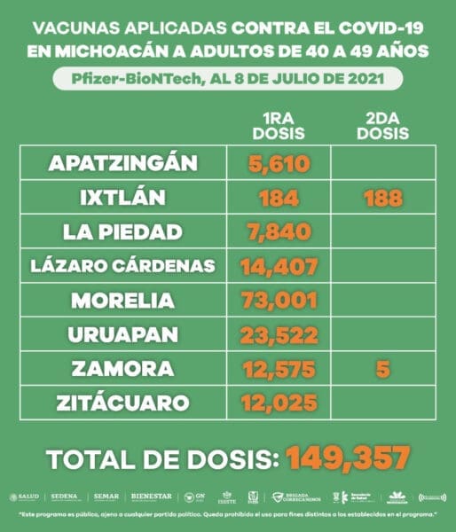 Morelia, Michoacán, a 8 de julio de 2021.- De acuerdo con el reporte epidemiológico emitido por la Secretaría de Salud de Michoacán (SSM), se han confirmado 13 mil 064 casos de COVID-19 en personas de entre 40 y 49 años de edad, lo que representa el 20.13 por ciento del total en la entidad.