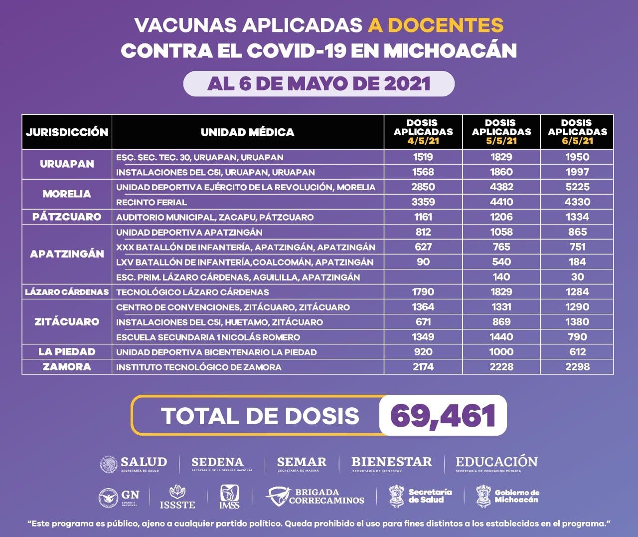 La aplicación del biológico se lleva a cabo de manera intersectorial, a través de la Brigada Correcaminos, en la que participan Sedena, Guardia Nacional, IMSS, ISSSTE, Secretaría de Educación en el Estado, Secretaría de Salud de Michoacán y SEP federal.