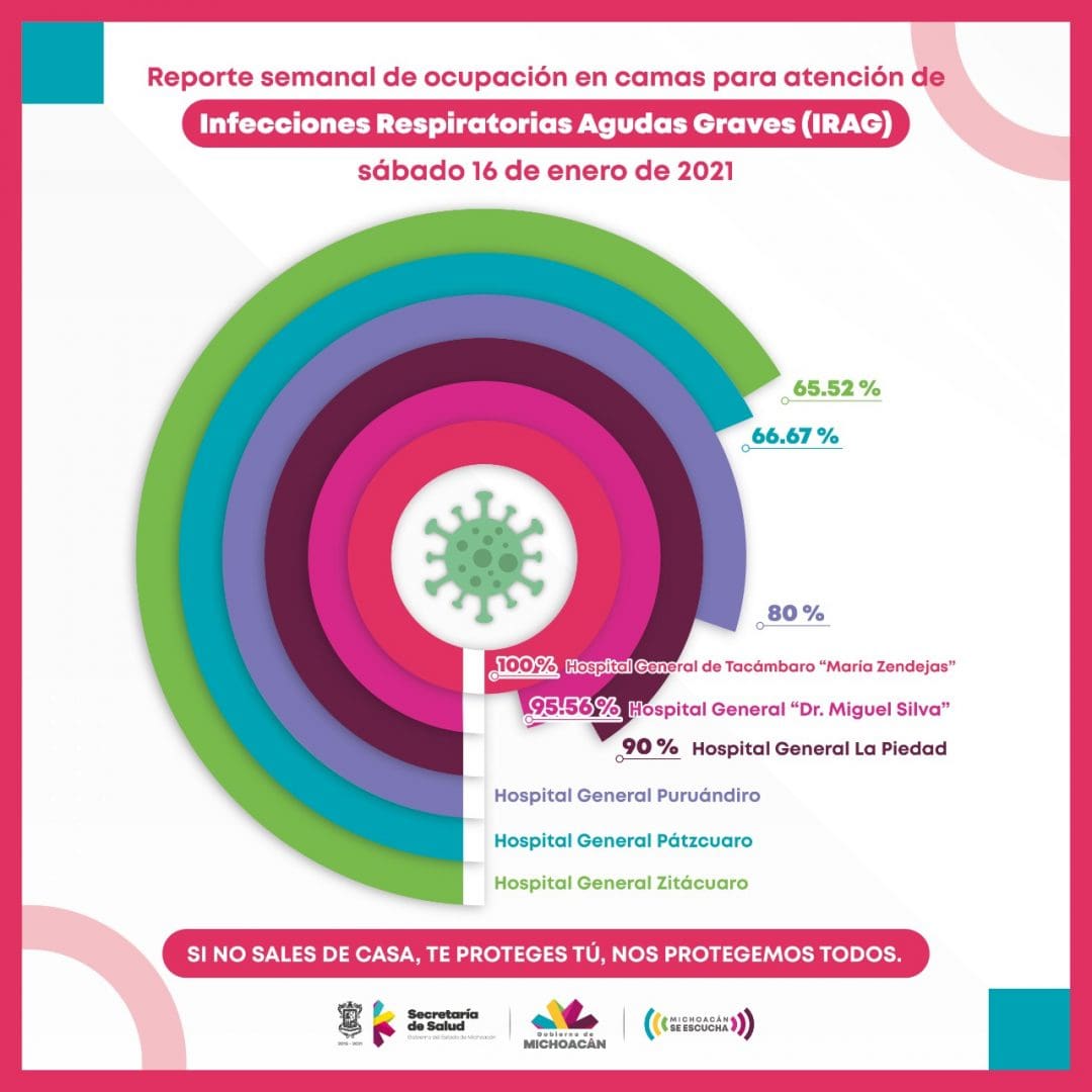 El hospital de Tacámbaro se encuentra al 100 por ciento de ocupación en camas para atención de Infecciones Respiratorias Agudas Graves (IRAG), le siguen el “Dr. Miguel Silva” (95.56%), La Piedad, (90%) y Puruándiro (80%).