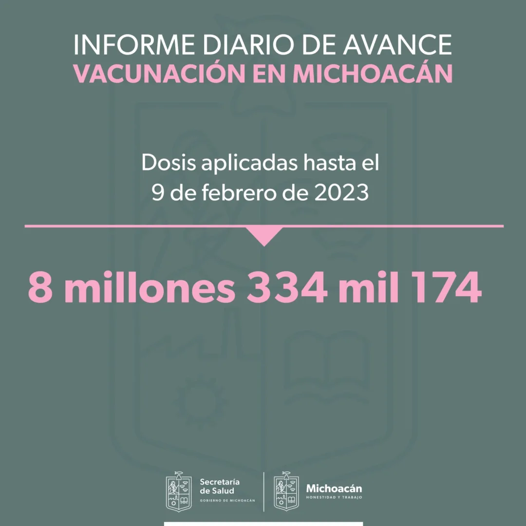 La dependencia estatal reporta que desde el inicio de la campaña de vacunación a la fecha se han aplicado 8 millones 334 mil 174 dosis de vacunas contra el COVID-19 a la población de cinco años en adelante, y 2 millones 049 mil refuerzos.